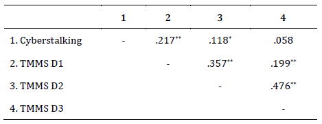 The total percentage of explained variance for the scale was 44.263 %. Regarding internal consistency, it was deemed adequate (α = .841; ω = .853). Subsequently, the relationship between cyberstalking levels and the three dimensions of emotional intelligence were examined (Table 2).