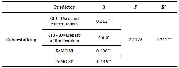 Finally, regression analyses were conducted, with FoMO and CIUS as independent variables, to examine their effects on cyberstalking. In Table 3, it can be observed that the percentage of explained variance is significant, although not very high. Out of the four variables included in the model, CIUS uses and consequences, and the two dimensions of FoMO were found to be significant.
