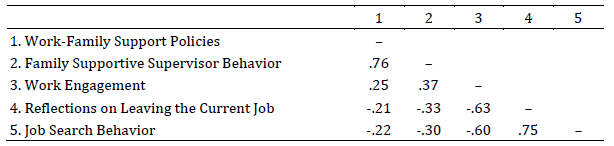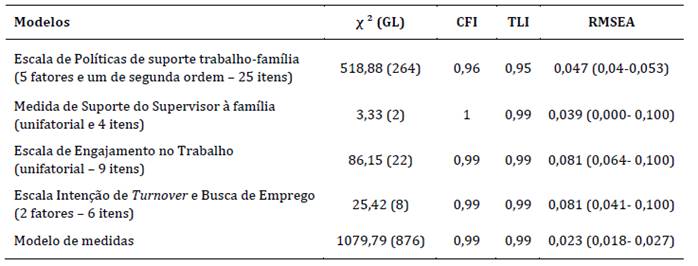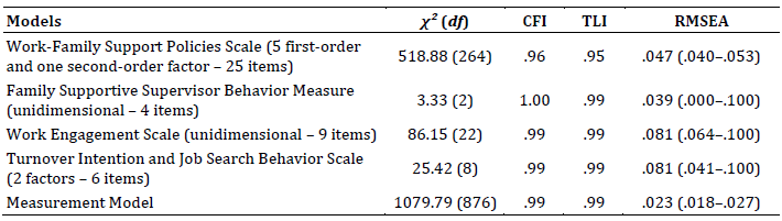Para avaliar a estrutura interna dos instrumentos utilizados, inicialmente foram realizadas análises fatoriais confirmatórias para cada escala e, em seguida, a análise do modelo de medidas. Os instrumentos tiveram sua estrutura confirmada, com obtenção de bons índices de ajuste. Ou seja, as seguintes estruturas foram encontradas como adequadas: Escala de Políticas de Suporte Trabalho-Família: 25 itens, divididos igualmente em cinco fatores de primeira ordem (Facilidades Organizacionais, Trabalho flexível, Políticas de parentalidade e gestação, Comunicação e apoio psicológico, Gestão de trabalho) e um de segunda ordem (políticas de suporte trabalho-família); Versão breve da Medida de Comportamento do Suporte do Supervisor à Família: 4 itens e um fator; Escala Utrecht de Engajamento no Trabalho: nove itens e um fator; Escala Intenção de Turnover e Busca de Emprego: seis itens divididos igualmente em dois fatores (Reflexões sobre sair do emprego atual e Comportamento de busca de emprego). O modelo de medida também apresentou bons índices de ajuste e cargas fatoriais adequadas (0,43 a 0,98; M = 0,76). Assim, os itens foram explicados por suas respectivas variáveis latentes (Tabela 1).