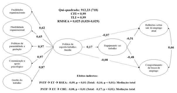 Tais resultados indicam que o engajamento no trabalho mediou totalmente as relações das políticas de suporte trabalho-família com a reflexão sobre sair do emprego atual e com o comportamento de busca de emprego, o que confirmou a Hipótese 3 do estudo. A Tabela 3 traz a síntese das relações encontradas. A Figura 1 apresenta a versão final do referido modelo, com os parâmetros padronizados.