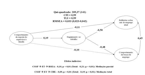 No outro modelo, na presença a variável mediadora engajamento no trabalho, a associação do comportamento de suporte do supervisor à família com a reflexão sobre sair do emprego atual reduziu, porém continuou a ser estatisticamente significativa. Por outro lado, a relação do comportamento de suporte do supervisor à família com o comportamento de busca de emprego reduziu e deixou de ser significativa (Tabela 4). De mais a mais, a associação do engajamento no trabalho com a reflexão sobre sair do emprego atual (β = -0,50; p < 0,001) e do engajamento no trabalho com o comportamento de busca de emprego (β = -0,48; p > 0,001) foram significativas. O mesmo ocorreu com a relação do comportamento de suporte do supervisor à família com o engajamento no trabalho (β = -0,19; p > 0,001). Por fim, os efeitos indiretos da VI com as VDs e os efeitos totais (comportamento de suporte do supervisor à família à engajamento no trabalho à reflexão sobre sair do emprego atual: -0,10; p < 0,001; total: 0,21; 0,001; comportamento de suporte do supervisor à família à engajamento no trabalho à comportamento de busca de emprego: -0,09; p < 0,001; total: -0,19; p < 0,001) foram significativos.