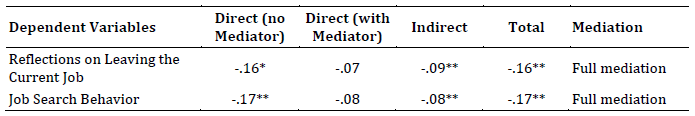 In the first model (IV: work-family support policies), without the inclusion of the mediating variable (work engagement), the results indicated a direct, negative, and significant relationship between work-family support policies and both reflections on leaving the current job and job search behavior. These findings confirmed Hypothesis 1 (see Table 3). In the second model, family-supportive supervisor behavior also showed a direct, negative, and significant relationship with reflections on leaving the current job and job search behavior. These results supported Hypothesis 2 (see Table 4).