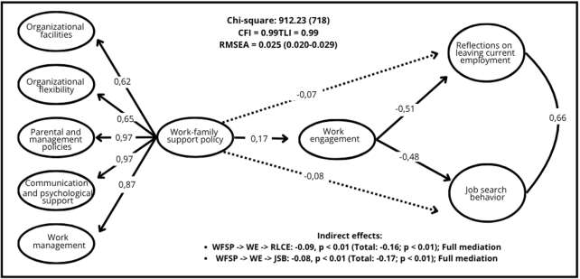 These results indicate that work engagement fully mediated the relationships between work-family support policies and both reflections on leaving the current job and job search behavior, confirming Hypothesis 3. Table 3 presents a summary of these relationships, and Figure 1 illustrates the final version of the model with standardized parameters.