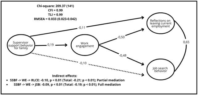 These results indicate that work engagement partially mediated the relationship between supervisor family-supportive behaviors and thinking about leaving the current job, and fully mediated the relationship between supervisor family-supportive behaviors and job search behavior, which supports Hypothesis 4. Table 4 summarizes the relationships found. Figure 2 presents the final version of the model, with standardized parameters.
