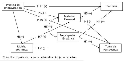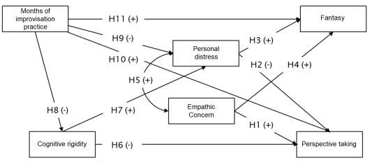 The objective of this study was to analyze the statistical contribution of months of theatre improvisation practice and cognitive rigidity on empathy from the affect -to-cognition model of empathy using an integrated statistical model. The hypotheses stated are shown in Figure 1.