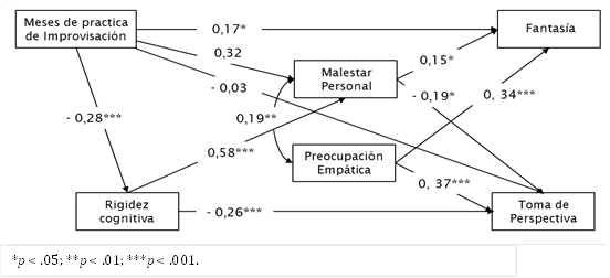 The study concludes that improvisation practice time contributes directly to fantasy variability and indirectly to perspective taking and personal distress, mediated by cognitive rigidity. Furthermore, it is concluded that the affect-to-cognition model of empathy is applicable to the Latin American context and the relationships of affective factors and fantasy may be associated with emotion management. Additionally, it is specified that the practice of theatrical improvisation can be a tool that increases the effectiveness of interventions aimed at increasing empathy, if it is complemented with strategies to manage emotions and uncertainty.