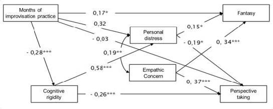 Thus, the model obtained a good fit (χ²/df = 0, 473; CFI = 1.000; IFI = 1.010; RMSEA = .000 (IC90 % = .000 - .073); SRMR = .020 (Kline, 2011). Hypothesized relationships and estimated coefficients are displayed in Figure 2. Most hypotheses were supported, with the exception of H9 (months of improvisation practice → personal distress) and H10 (months of improvisation practice → perspective‑taking). Subsequently, an alternative model was tested excluding the unfulfilled hypotheses. The model had a good fit (χ²/df = 0, 416; CFI = 1.000; IFI = 1.017; RMSEA = .00 (IC90 % = .00 - .047); SRMR = .021) (Kline, 2011).