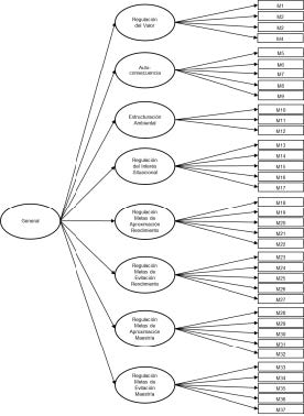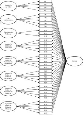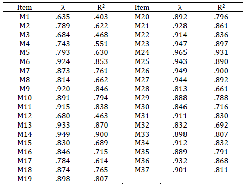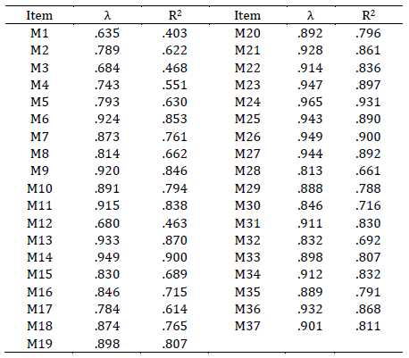De todos los modelos puestos a prueba el que registró un mejor ajuste fue el Modelo 1, correspondiente al AFC de 8 factores de primer orden (Tabla 1). Todos los parámetros estimados en el modelo de primer orden fueron estadísticamente significativos. De los 37 ítems, 34 obtuvieron coeficientes de regresión óptimos, superiores a .70 (Tabla 2). Todos los residuos estandarizados obtuvieron valores inferiores a 1.