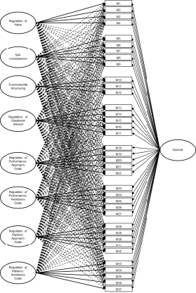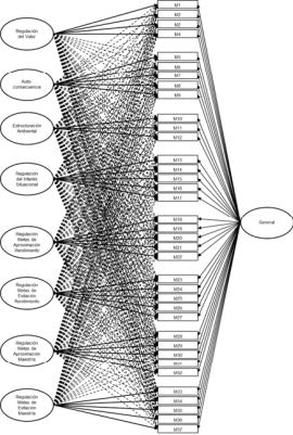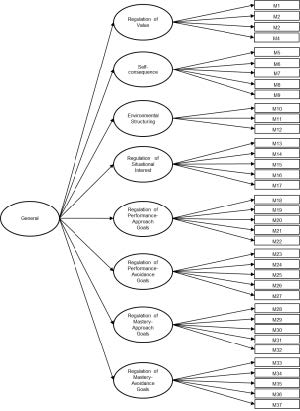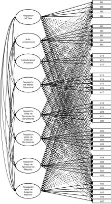 The procedure began with the analysis of the locally adapted MRSQ’s internal structure. Several confirmatory factor analysis (CFA) models were tested—eight first‑order factors (Model 1), eight second‑order factors (Model 2), and a bifactor model (Model 3)—as well as exploratory structural equation models (ESEM): eight factors (Model 4), eight hierarchical factors (Model 5), and a bifactor structure (Model 6). Among these, the first‑order eight‑factor CFA demonstrated the best fit indices. All estimated parameters in this model were statistically significant, and 34 of the 37 items showed optimal factor loadings above .70 (i.e., R² > .50), indicating that each of these items explains more than 50 % of its variance by the associated latent factor (Chicco et al., 2021). The three items falling below the .70 threshold were item 1 (“I imagine situations in which knowing the material or skills would be useful to me”) and item 3 (“I strive to relate what I’m learning to my personal interests”), both within the Value Regulation factor, and item 12 (“I change my environment to make it easier to concentrate on my work”), from the Environmental Structuring dimension. Although these items are somewhat less representative of their respective dimensions, their loadings exceed .40 and are therefore acceptable. Practically, this finding allows users of the instrument to pinpoint the most salient items and, in reporting, highlight students’ strengths and weaknesses based on their responses to these specific items. Overall, these results provide additional empirical support for the proposed model in the Argentinean Cordoban adaptation.