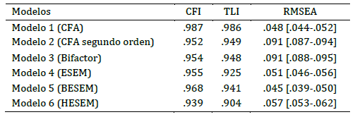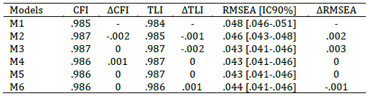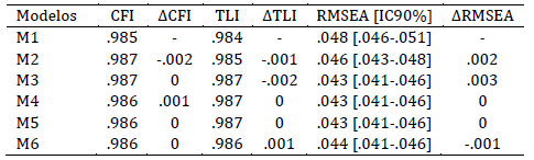 Nota: M1: Configural; M2: Débil; M3: Fuerte; M4: Estricta; M5: Varianza-covarianza latente; M6: Medias latentes.