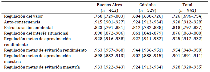 Luego se estimó la consistencia interna para cada dimensión mediante el coeficiente omega, para la muestra total y para las submuestras de estudiantes de Buenos Aires y Córdoba. Se obtuvieron valores entre adecuados y óptimos. A continuación, se compararon los coeficientes obtenidos para cada dimensión en las tres muestras —Total, Buenos Aires y Córdoba—, se verificó una consistencia interna similar en todos los casos con excepción de las dimensiones regulación del valor, regulación del interés situacional y regulación metas de evitación rendimiento (Tabla 4).
