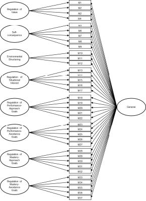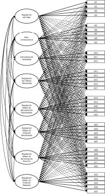 To analyze the instrument’s internal structure, several models were tested to determine which fit the empirical data best. First, using confirmatory factor analysis (CFA), a Model 1 of eight first‑order factors (Figure 1) was evaluated, then a Model 2 of eight second‑order factors (Figure 2), and a Model 3 bifactor model (Figure 3). Next, via exploratory structural equation models, a Model 4 ESEM with eight first‑order factors (Figure 4), followed by a Model 5 BESEM bifactor (Figure 5), and finally a Model 6 HESEM hierarchical model (Figure 6) were tested.