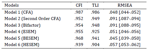 Para analizar la estructura interna del instrumento se pusieron a prueba distintos modelos con el fin de verificar cuál de ellos presentaba un mejor ajuste de los datos empíricos. Se testearon así, mediante análisis factorial confirmatorio (AFC), un Modelo 1 de 8 factores de primer orden (Figura 1), luego un Modelo 2 de 8 factores de segundo orden (Figura 2) y un Modelo 3 bifactor (Figura 3). A continuación, mediante modelos de ecuaciones estructurales exploratorio, se probó un Modelo 4 ESEM con una estructura de 8 factores de primer orden (Figura 4), luego un Modelo 5 BESEM bifactor (Figura 5) y finalmente un Modelo 6 HESEM jerárquico (Figura 6).