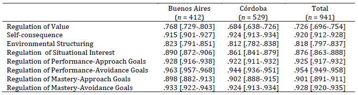 Internal consistency for each dimension was then estimated using the omega coefficient for the total sample and for the Buenos Aires and Córdoba subsamples. Values ranged from adequate to optimal. The omega coefficients for each dimension were compared across the three groups—Total, Buenos Aires, and Córdoba—and showed similar internal consistency in all cases except for the dimensions Value Regulation, Situational Interest Regulation, and Performance‑Avoidance Goal Regulation (Table 4).
