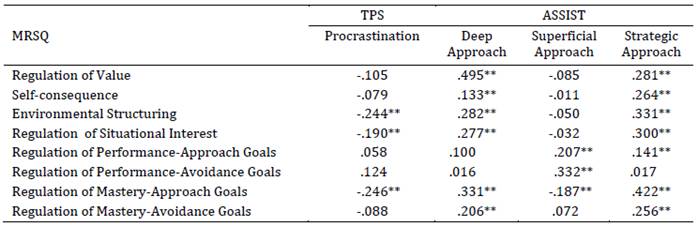 The Strategic approach, in turn, was significantly correlated with all MRSQ dimensions except Performance‑Avoidance Goal Regulation. This lack of association is reasonable when considering that the Strategic approach focuses on the resources that students deploy to achieve good academic results—such as organization and time management. By contrast, the Performance‑Avoidance Goal Regulation dimension concerns everything students do to avoid academic failure (Entwistle et al., 2013; Sánchez‑Rosas et al., 2019).
