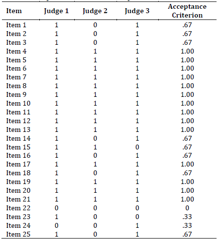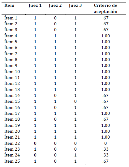 En primer lugar, se reportan los resultados de la validez de jueces para cada ítem. En la Tabla 1 se presentan las respuestas de los jueces, donde 1 es que acepta el ítem y 0 que no acepta el ítem. A partir de los resultados, se aceptan los ítems que son calificados positivamente por al menos dos jueces.