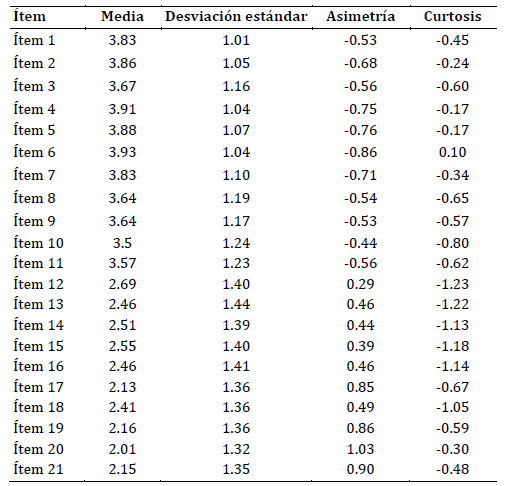 En la Tabla 2 se presentan los resultados descriptivos de los 21 ítems. La normalidad multivariada fue evaluada mediante la prueba de Henze-Zirkler (HZ), la cual mostró resultados significativos (HZ = 3.65, p < .001), lo que indica que los datos no siguen una distribución normal multivariada.