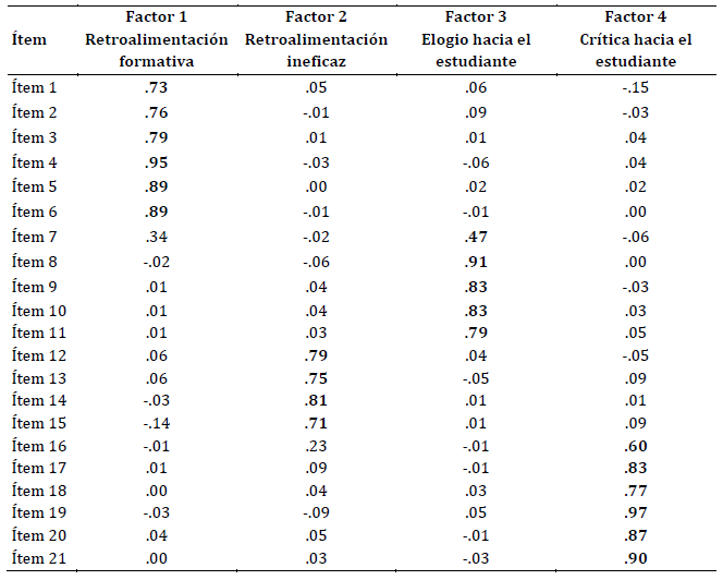 Es importante mencionar que, según los resultados, se podrían considerar solamente dos dimensiones. Sin embargo, no se optó por esta aproximación por dos motivos. En primer lugar, la teoría revisada planteaba una distinción de 4 dimensiones, lo que permitía un análisis más delimitado del constructo. En segundo lugar, si se analizan conceptualmente las dimensiones, se podría argumentar —desde el punto de vista del estudiante— que estas dos dimensiones podrían englobar a las cuatro finales. Eso se debe a que dos de estas dimensiones hablan acerca de la retroalimentación desde un enfoque negativo para el estudiante (retroalimentación ineficaz y crítica hacia el estudiante), mientras que las otras dos dimensiones se enfocan en aspectos positivos (retroalimentación formativa y elogio hacia el estudiante). Se podría considerar explorar esta delimitación para futuras investigaciones con el constructo y corroborar la relevancia de un instrumento de dos dimensiones.