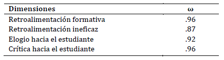 Respecto a la confiabilidad interna, se corrobora la congruencia entre los ítems del cuestionario y las dimensiones propuestas con el coeficiente omega de McDonald, los cuales fueron superiores a .87 en todas sus dimensiones (Hair, 1998; Hair et al., 2009; Ventura-León & Caycho-Rodríguez, 2017). Ello es similar a otras escalas de retroalimentación docente que evalúan diversos aspectos o tipos de retroalimentación, como es la retroalimentación a nivel de la tarea, el proceso, la autorregulación o hacia la persona (Hattie & Timperley, 2007); retroalimentación de refuerzos y castigos, correctiva, y con alto contenido de información (Wisniewski et al. 2020); o retroalimentación de verificación, directa, de andamiaje, elogios o críticas (Guo & Wei, 2019).