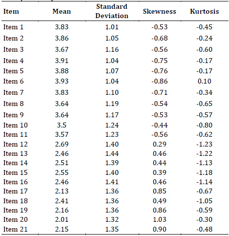 Next, the descriptive data for the items in the instrument were analyzed, reporting the mean, standard deviation, skewness, and kurtosis.