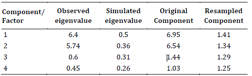 The results indicated that the first four real eigenvalues of the factors were greater than the corresponding randomly generated eigenvalues, suggesting the retention of four factors in the EFA (Table 3).