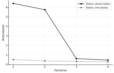 Según los resultados del AFE, el test de esfericidad de Bartlet es significativo (p < .001) y el KMO (0.93) aceptable. Para determinar el número óptimo de factores a retener se realizó un análisis paralelo utilizando 100 simulaciones aleatorias. Se empleó una matriz de correlaciones policóricas debido a la naturaleza ordinal de los ítems.