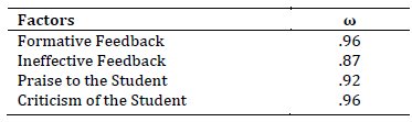With regard to internal reliability, the consistency between the questionnaire items and the proposed dimensions was verified using McDonald's omega coefficient, which was greater than .87 in all dimensions (Hair, 1998; Hair et al., 2009; Ventura-León & Caycho-Rodríguez, 2017). This is similar to others teacher feedback scales that assess various aspects or types of feedback, such as task-level, process-level, self-regulation, or person-level feedback (Hattie & Timperley, 2007); reinforcement and punishment feedback, corrective feedback, and feedback with a high information content (Wisniewski et al., 2020); or verification feedback, direct feedback, scaffolding feedback, praise or criticism (Guo & Wei, 2019).