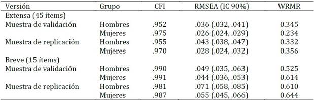 En cuanto a los ítems seleccionados para el ESCQ-T15, se observó que presentan un grado aceptable de asociación dentro de cada factor, tanto la muestra de validación (EEE: rpromedio = .303; PCE: rpromedio = .564; GRE: rpromedio = .241) como de replicación (EEE: rpromedio = .346; PCE: rpromedio = .547; GRE: rpromedio = .278), lo que indica la ausencia de redundancia. Por otro lado, en cuanto al análisis estructural preliminar de la versión extensa, los índices de ajuste fueron aceptables en hombres y mujeres en ambas muestras (Tabla 1).