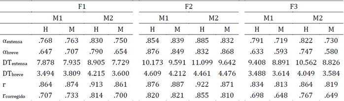 Tabla 2: Reporte de fiabilidad y equivalencia entre versiones