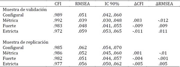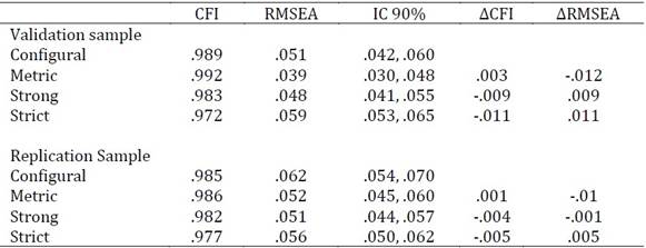 Thus, excellent fit indices were found for the total sample (n = 1619; CFI = .989; RMSEA = .050, IC 90% .044, .055; WRMR = 0.016), as well as acceptable factor loadings in all cases and significant associations (> .20) between dimensions (Table 5).