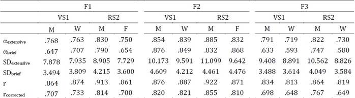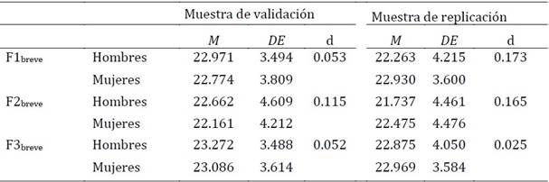 Likewise, regarding the equivalence between the long and short version (according to sample and gender), most dimensions are equivalent between versions in the two samples studied according to the corrected correlation coefficient (> .70; Table 2), as only the MRE dimension in the validation sample is slightly below the established limit in three comparisons. Overall, specific hypothesis 2 was supported.