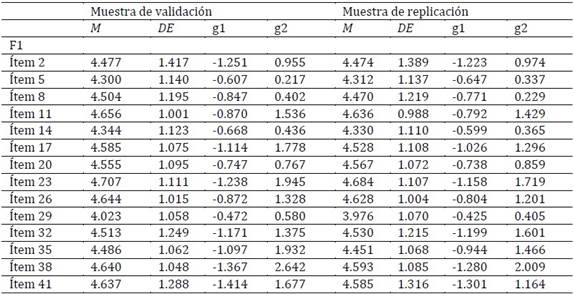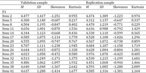 El análisis preliminar indica que la normalidad multivariada no recibió respaldo en la muestra de validación (G2 = 560.162) ni en la de replicación (G2 = 555.447). Sin embargo, los ítems presentan magnitudes aceptables de asimetría y curtosis (Apéndice A, Tabla A1).