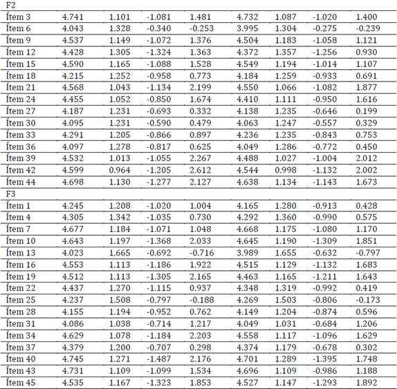 Antes de analizar las evidencias de validez con relación a la estructura interna de la versión extensa, que sirvió de base para la versión breve, se ejecutó un análisis descriptivo preliminar de los ítems. La normalidad univariada se valoró según la asimetría (< 2) y curtosis (< 7), mientras que la normalidad multivariada se analizó mediante el coeficiente G2 (< 70).