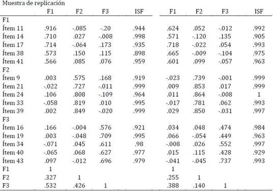 El análisis se enmarcó en el ESEM (Asparouhov & Muthén, 2009) con el weighted least squares mean-variance adjusted (WLSMV) para las muestras de validación (n = 776) y replicación (n = 843), con rotación target oblicua (ε = .5; Asparouhov & Muthén, 2009), es decir, que se estimaron libremente las cargas factoriales pertenecientes al factor principal, mientras que las cargas factoriales secundarias se especificaron como próximas a cero (~0).