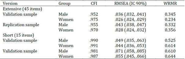 Regarding the items selected for the ESCQ-T15, it was observed that they present an acceptable degree of association within each factor in both the validation sample and the validation sample (ELE: raverage = .303; PUE: raverage = .564; MRE: raverage = .241) as well as replication (ELE: raverage = .346; PUE: raverage = .547; MRE: raverage = .278), indicating a lack of redundancy. On the other hand, as for the preliminary structural analysis of the extended version, the fit indices were acceptable for males and females in both samples (Table 1).