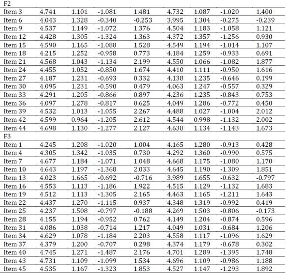 Preliminary analysis indicates that multivariate normality was not supported in the validation sample (G2 = 560.162) nor the replication (G2 = 555.447). However, the items show acceptable magnitudes of skewness and kurtosis (Appendix A, Table A1).
