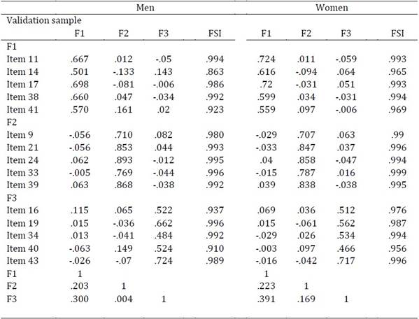Regarding the ESEM analysis, the ESCQ-T15 showed good fit indices for both men and women in the validation and replication samples (Table 1). Specifically, acceptable factor loadings are also observed for all items (short version) and an acceptable degree of factor complexity and significant interfactor correlations between dimensions in all groups (Appendix B, Table B1). These results empirically support specific hypotheses 1.1 and 1.2.