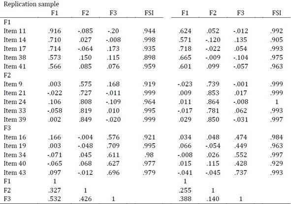 The measurement models were evaluated in the validation and replication samples. The relevance of the models was assessed by considering fit indices such as the comparative fit index (CFI; > .90), the root mean square error of approximation (RMSEA; < .08), and the weighted root mean square residual (WRMR; £ 1.00). In the case of the short version, we assessed the magnitude of the factor loadings (> .50) and, additionally, considering the main focus (ESEM), we analysed whether the secondary loadings impact the internal structure of the scale. In this sense, the factorial simplicity index (FSI) was estimated, which reports whether the item is predominantly influenced by one or more factors, and magnitudes greater than .70 indicate that an item is predominantly influenced by a single factor. Similarly, interfactor correlations were considered significant above .20.