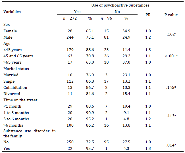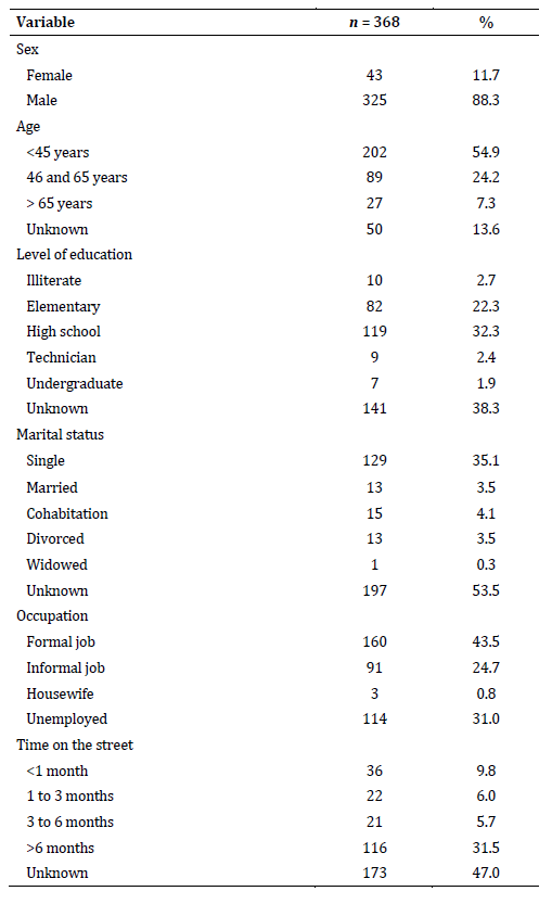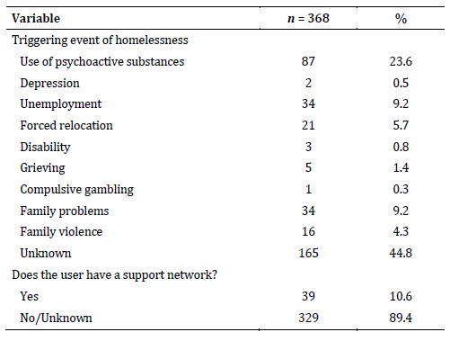 From the census that identified 723 users of the program between 2018 and 2022, 368 unhoused persons were selected who complied with the characteristic of completeness of information about the consumption of psychoactive, of whom 88.3 % were men, with ages between 16 and 80, and an average of 41.1 years (SD =14.8). Of the users, 54.6 % had an elementary or high school degree, and 38.3% did not provide this information. Regarding marital status, 35.1 % indicated that they were single, followed by cohabitation; it should be noted that 53.5 % of the users did not have this information recorded. It was found that 31.5 % of those aware of their time on the streets had been homeless for more than 6 months. Eighty-seven participants (23.6 %) identified using psychoactive substances as the trigger for their situation on the street. Only 10.6 % of the users indicated having a support network, which could be family or close friends (Table 1).
