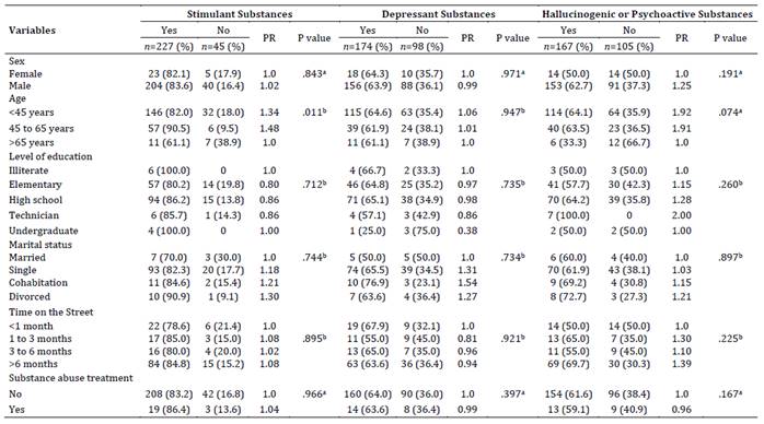 Conversely, having any level of education (primary, secondary, or technical) appeared to protect against the use of stimulant and depressant substances. Findings indicated a lower prevalence among educated participants than those without schooling. Participants who had been homeless for more than a month showed prevalence exceeding 80 % for stimulant use, higher than those reported for individuals who had been homeless for less than a month (RP > 1.0). Hallucinogenic or psychoactive substance use was also more prevalent among those who had been homeless for more than a month. Finally, among those who had undergone substance abuse treatment, prevalence for depressant and hallucinogenic or psychoactive substance use were below 60 %, lower than those reported among individuals who had not received treatment (Table 4).