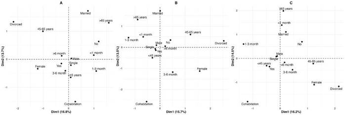 In Plot B (depressants), the axes accounted for 29.2 % of the variance (Dim 1 = 15.7 %, Dim 2 = 13.5 %). Here, individuals over 65 years old and those who were married tended to group in the upper-left quadrant, while women and divorced participants appeared on the far right. This pattern may reflect gender- and age-related consumption behaviors, possibly linked to emotional decline or chronic isolation.