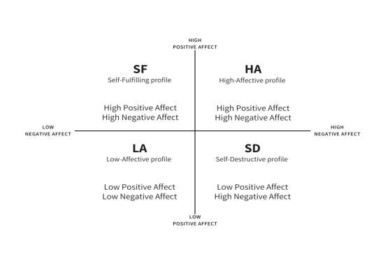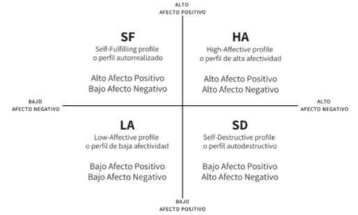 Considerando esta relativa independencia de AP y AN, Norlander et al. (2002) propusieron un modelo (posteriormente llamado modelo de los perfiles afectivos) que identifica y nombra cuatro posibles combinaciones de alto/bajo AN y AP (Figura 1): un perfil autorrealizado (SF, Self-Fulfilling), un perfil auto-destructivo (SD, Self-Destructive), y perfiles de alta y baja afectividad (HA y LA, High/Low Affective).