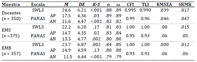 Como se observa en la Tabla 1, las escalas mostraron valores aceptables de α y ω, y un ajuste excelente de SV para las tres muestras, similar a lo reportado por Mikulic et al. (2019), Ruiz et al. (2019) y Melo et al. (2023). En el caso de PANAS, el ajuste del modelo es excelente para docentes y aceptable para estudiantes de EMS y EMB.