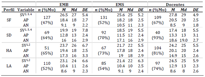 Los resultados sugieren la existencia de diferencias significativas en el puntaje en SV entre los perfiles para EMB (χ²(gl= 3) = 39.12, p < .001, η2 = 0.1), EMS (χ²(gl= 3) = 73.77, p < .001, η2 = 0.19) y docentes (χ²(gl= 3) = 75.36, p < .001, η2 = 0.21). En todas las muestras, los resultados de la comparación por pares (Tabla 2) sugieren la existencia de diferencias significativas en SV entre todos los perfiles excepto entre LA y HA.