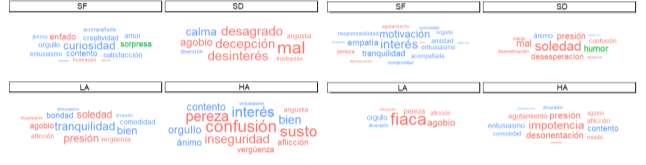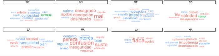 Note: Size indicates TF-IDF value; color, the polarity of the word in DAVE: negative (red), positive (blue) or neutral-ambivalent (green). Words are presented in their original language; the translations of the words in each wordcloud are presented by decreasing size. For EMB sample (left), SF profile: curiosity, contentment, creativity, anger, satisfaction, surprise, pride, enthusiasm, accompanied and love; SD profile: disappointment, disgust, disinterest, bad, overwhelm, calmness, anguish, fun, frustration; LA profile: tranquility, pressure, loneliness, well, overwhelm, kindness, comfort, distress, shame; HA profile: confusion, insecurity, interest, laziness, fright, well, contentment, pride, distress, shame, mood, anguish, enthusiasm. For EMS (right) sample, SF profile: interest, motivation, tranquility, empathy, enthusiasm, companionship, friendship, responsibility, laziness, exhaustion, pride, commitment, comfort; SD profile: loneliness, despair, pressure, confusion, mood, bad, lack of motivation, fear; LA profile: laziness ("fiaca", rioplatense Spanish slang), overwhelm, pride, laziness, distress, fun; HA profile: powerlessness, disorientation, pressure, exhaustion, enthusiasm, content, distress, comfort, fear, overwhelm and fun.