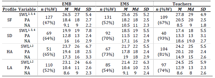 Results suggest significant differences in SWL scores across profiles for EMB (χ²(df= 3) = 39.12, p < .001, η2 = 0.1), EMS (χ²(df= 3) = 73.77, p < .001, η2 = 0.19) and teachers (χ²(df= 3) = 75.36, p < .001, η2 = 0.21). In all samples, pairwise comparison results (Table 2) suggest significant differences in SWL between all profiles except between LA and HA.