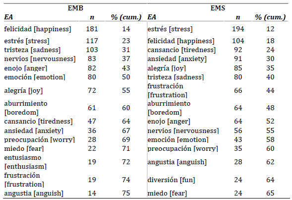 Es de notar que la proporción representada por las 15 palabras más frecuentes es menor en la muestra de EMS, lo cual sugiere el uso de un vocabulario más amplio. Se aprecia que en ambas muestras es mayor la proporción de EA con polaridad negativa: en el caso de EMB, el 53.1 % son negativas, el 8.1 % neutras-ambivalentes y el 38.8 % positivas, mientras que en el de EMS el 65.8 % son negativas, el 5.7 % neutras-ambivalentes y el 28.3 % positivas.