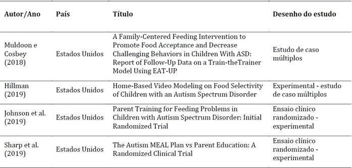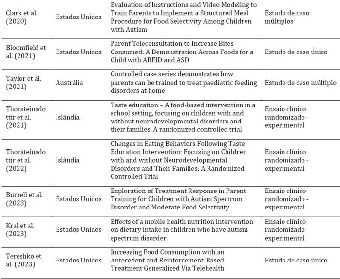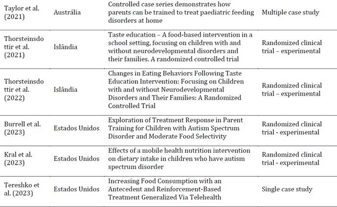 De From 2018 to 2023, 12 empirical studies published in journals on parental training for children with autism and selective eating were found. All 12 articles were published in foreign journals, with a growing increase in the number of publications since 2019, as illustrated in Table 1. The journal Behavior Analysis in Practice showed the highest frequency of publications, totaling two articles (Bloomfield et al., 2021; Clark et al., 2020). The journal Appetite also had two articles published (Thorsteinsdottir et al., 2021; 2022), as did the Journal of Pediatric Psychology (Johnson et al., 2019; Sharp et al., 2019). The other journals published one article each, namely: Clinical Case Studies (Tereshko et al., 2023), Acta Paediatrica (Taylor et al., 2021), Journal of Autism and Developmental Disorders (Burrell et al., 2023), Physical Occupational Therapy in Pediatrics (Hillman, 2019) and Frontiers in Pediatrics (Kral et al., 2023), in addition to the American Journal of Speech-Language Pathology (Muldoon & Cosbey, 2018).