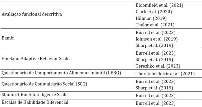 Ao longo da análise, foi possível perceber a utilização de escalas para avaliação nas pesquisas. Observa-se a utilização de três categorias distintas de instrumentos: (1) instrumentos que avaliam comportamento alimentar e seletividade, (2) instrumentos que avaliam aspectos do comportamento e do desenvolvimento, e (3) instrumentos que avaliam a percepção parental (Tabela 2).