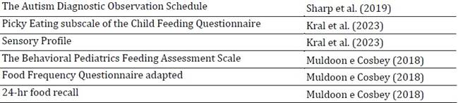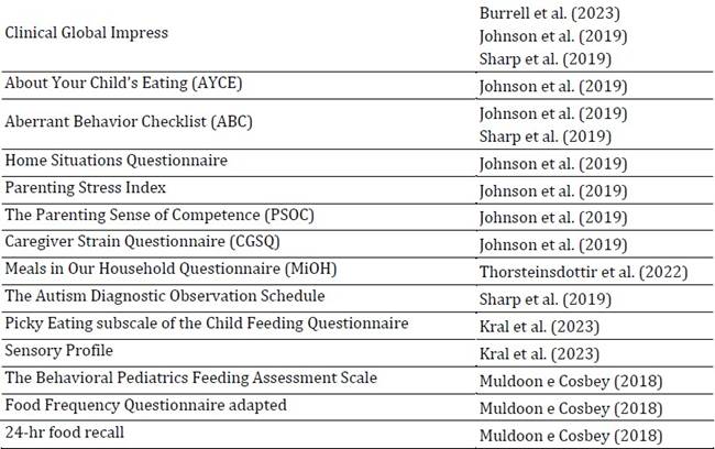 Throughout the analysis, it was possible to observe the use of scales for evaluation in the studies. Three distinct categories of instruments were used: (1) instruments that assess eating behavior and selectivity, (2) instruments that assess aspects of behavior and development, and (3) instruments that assess parental perception (Table 2).